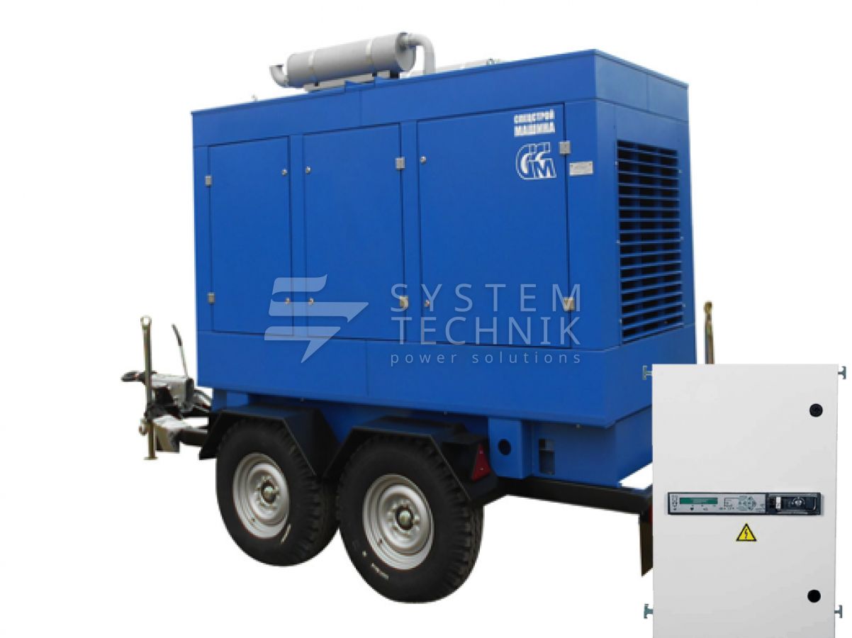 - ССМ ЭД-120-Т400-2РКМ2 (Marelli) в шумозащитном кожухе на шасси с АВР на прицепе